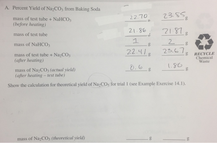 Experiment 6 - Thermal Decomposition of Sodium Na2CO3 (s) + H2O (g) + CO2 on the basis of your laboratory work, which will involve heating a weighed sample of sodium bicarbonate in a crucible and weighing the residue left in your crucible after heating. From the mass of ... Read Document
